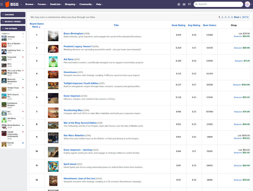 Boardgamegeek.com Top-100 listaa heinäkuulta 2025.