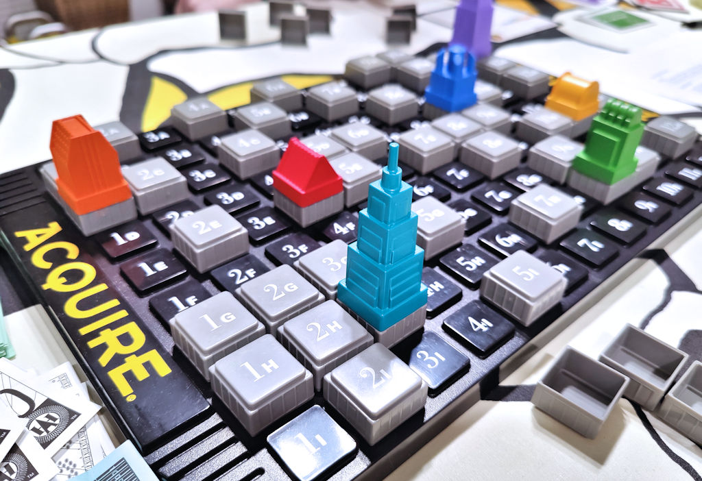 Hyvä peli. Acquire on klassikko vuosikymmenten takaa. Onhan tässä pelikin ja parhaimmillaan päätöksenteko on välillä sopivan kimuranttiakin, mutta tuurin osuutta ei silti voi ohittaa. Tuppaa nimittäin käymään niin, että pöytäseurueessa jollekin jää aina tyhjä arpa, jolloin “olet kyydissä kun muut pelaavat”. Enemmän peliä pelanneiden kesken tämä on kuitenkin siinä määrin nopea tapaus, että em. ongelmallisuuden osaa antaa myös anteeksi. Acquiresta on lukuisa määrä eri versioita ja vaikka joukossa on aikamoinen määrä ei-niin-laadukkaita painoksia niin parhaat niistä miellyttävät silmää tänäkin päivänä (ks. kuvan Avalon Hill 1999 painos).