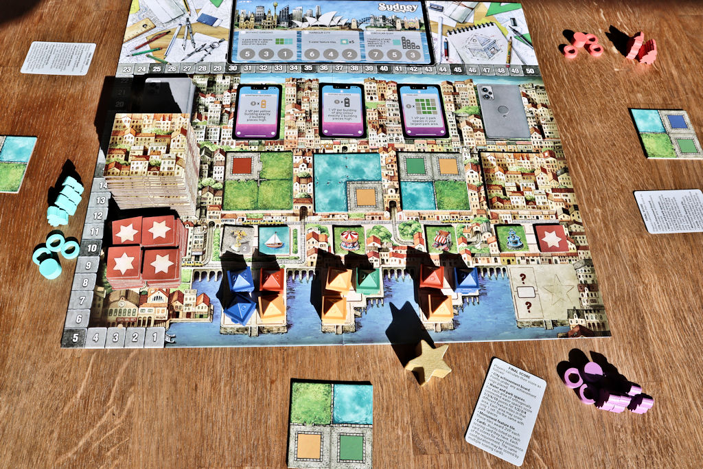 Olivat omat tai yleiset tavoitteet lopulta mitä tahansa, niin kahdeksan täyden pelikierroksen jälkeen kullakin pelaajalla on edessään “valmis” 3×3 kaupunkilaattamaisema rakennuksineen ja muine elementteineen. Lisäksi kullakin on édessään joukko henkilökohtaisia pisteytyskortteja jotka tarjoilevat omasta kaupunkimaisemasta pisteitä toivottavasti enemmän kuin muut saavat omistaan.