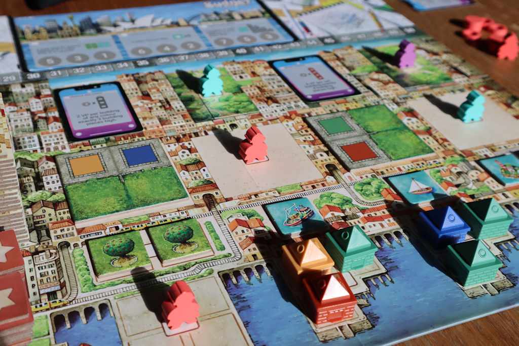 Neljässä värissä olevilla rakennuspalikoilla ja puisto- sekä vesielementeillä täytetään edellä mainittuja kaupunkilaattoja. Rakennuspalikat kelpaavat vain vastaavanvärisiin rakennusruutuihin ja samaa väriä voi myös pinota päällekkäin rakentaen maksimissaan neljän kerroksen korkuisia pilvenpiirtäjiä. Puisto- ja vesielementeistä pyritään tekemään erilaisten asioiden ryppäitä koska niistä ropisee pelin päätteeksi kaikille pisteitä. On joukossa vielä patsaslaattojakin, jotka vievät rakennusruudun antaen kuitenkin suoria pisteitä sekä jokerirakennusruutuja jolloin saa joustoa rakentamisväreihin.