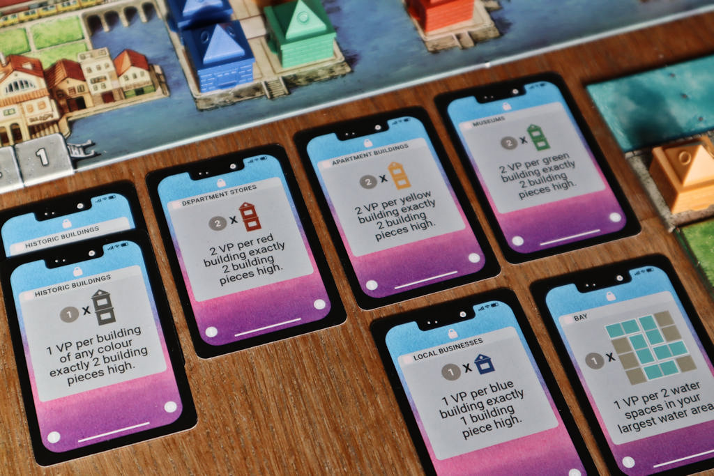 Pistekortit ovat tarjolla olevista kategorioista viime kädessä se tärkein. Voit toki rakennella pilvenpiirtäjiä, puistoja ja vesistöjä ihan kuinka haluat, mutta päätön rakentelu ei pistepottia kerrytä. Tarjooma kerrallaan poimitut pistekortit – joita lopulta kullekin kertyy kahdeksan kortin verran – antavat suunnan sille, mihin pyrkiä. Osa pistekorteista ohjaa rakentamaan tietynkorkuisia ja värisiä pilvenpiirtäjiä, osa isoja tai useita puistoja, vesistöjä tai jotain muuta.
