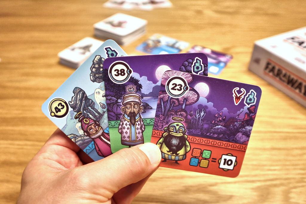 Farawayn hienous löytyy sen pisteytyksestä. Ei niinkään itse pisteytystavoissa jotka ovat tuttua huttua, mutta se että kortit pisteytetään käänteisessä järjestyksessä tekee pelille ihmeitä. Se on kuin lautapelien keikauskakku: rakennetaan ensin toisin päin, mutta flipataan lopulta ympäri – herkku on syntynyt!