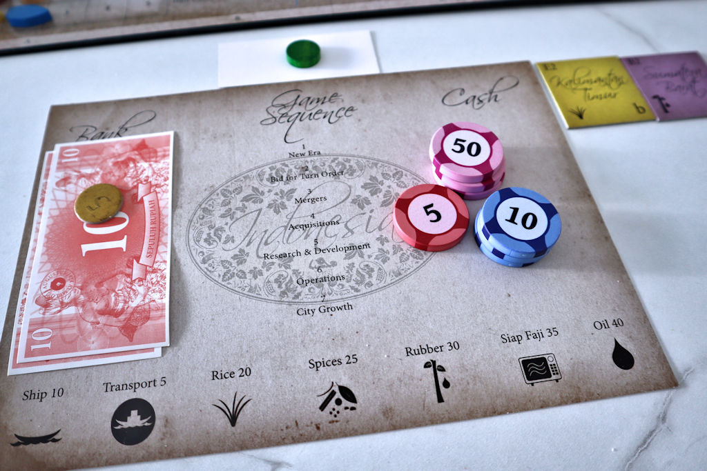 Toiseksi Indonesia on peli joka huutaa pokerichippien käyttöä etenkin kun pelin omat rahat ovat yhdistelmä paperirahaa ja pikkiriikkisiä pahvikolikoita. Pelin mukana tulevia rahoja tulee käytettyä enää ainoastaan “pankissa” eli kun kierroshuutokaupan jälkeen ne muuttaa chipeistä eri muotoon niin ei ole vaaraa, että pelaaja sekoittaa käteisvarojaan voittopisteisiin.