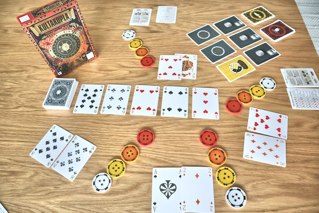 Peli Kultakoplaa kuluttaa pelikelloa noin 15 minuuttia joten puhutaan erittäin nopeasta ja jännitteisestä napakasta korttipelistä.
