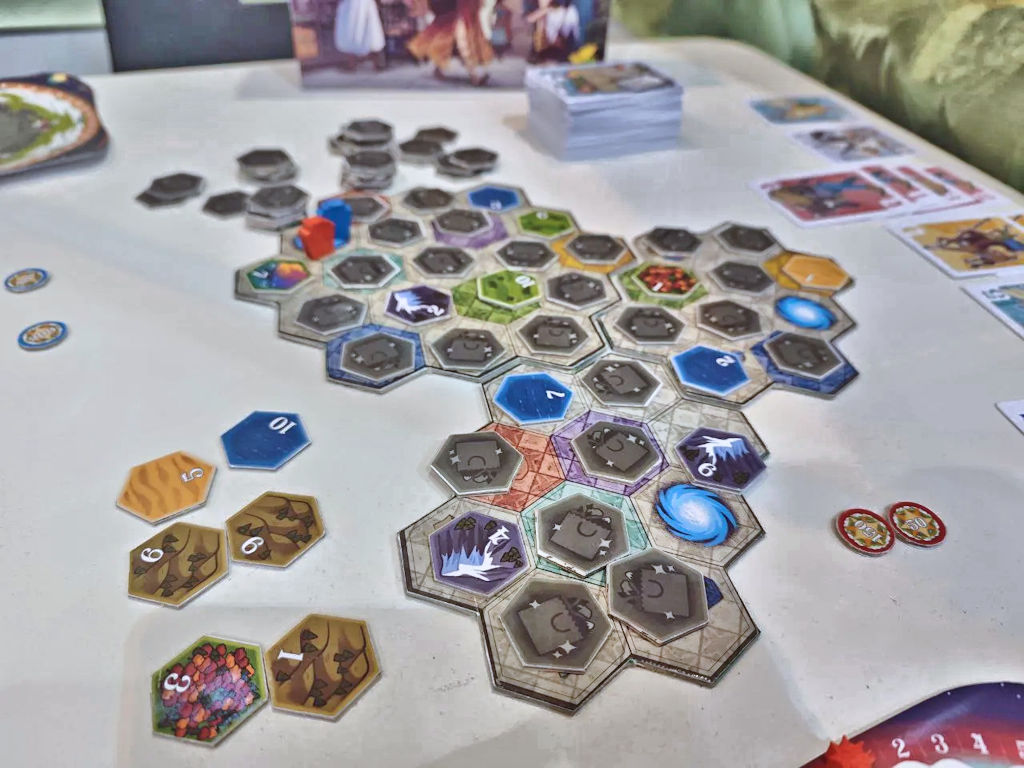 Kun aikanaan ruudukko on täytetty, siitä lasketaan pisteet ja sen jälkeen geneeriset puulaatat poistetaan ja pelataan vielä kaksi uutta ruudukon täyttöä vastaavasti mutta koko ajan himppasen edeltävää kierrosta isommalla ruudukolla. Eli omien jo aiemmin lykättyjen pisteytyksessä huomioitavien laattojen pistepotentiaali kasvaa jos vain saat ympäristön rakennettua näitä jo aiemmin asetettuja laattoja väistellen.