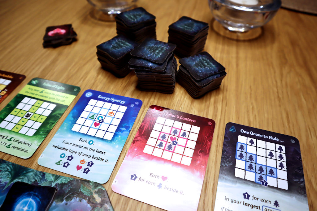 Kutakin valokiehkuratyyppiä ja metsiä varten on puolenkymmentä erilaista pisteytyskorttia mistä arpoa yksittäisen pelin tavoitteet, joten pelikertoihin saa miellyttävää variaatiota.
